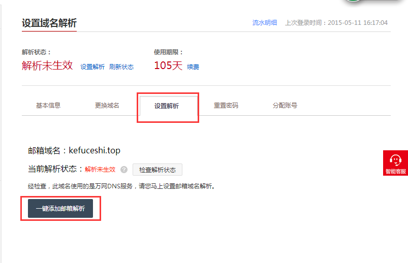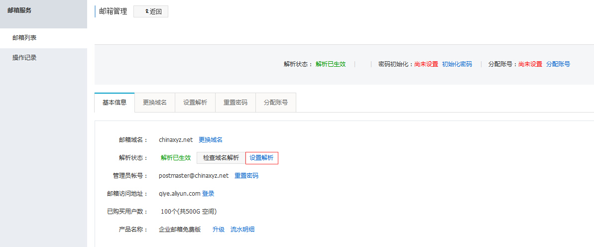 2)在邮箱管理列表中点击要设置解析的邮箱域名右边的【管理】,进入详细页后点击【设置解析】——【一键添加邮箱解析】;